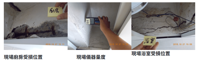 之後, 業主選擇使用本司的檢測服務。本司人員利用儀器測試排除法, 只需要在樓下進行有關的勘察, 再發出註冊測量師的簽署報告。業主攜同本報告到小額錢債審裁處進行索償申請。最後, 由於樓上業主未能提供證據及認可報告進行辯護, 所以法庭判決樓上業主敗訴。樓上業主需賠償包含本司的測試費, 樓下維修費等相關費用。