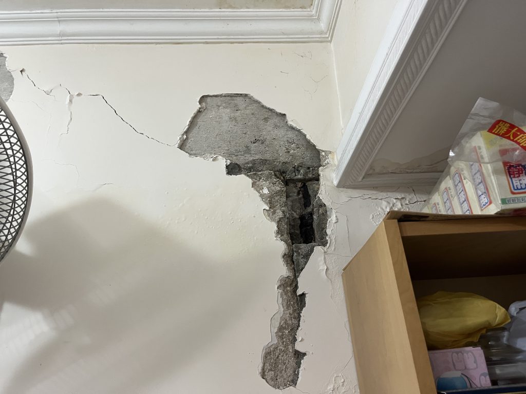 內容: 旺角一單位客廳,廁所,廚房及走廊都受滲漏影響。客廳牆身甚至可見鋼筋,結構已經出現危險。